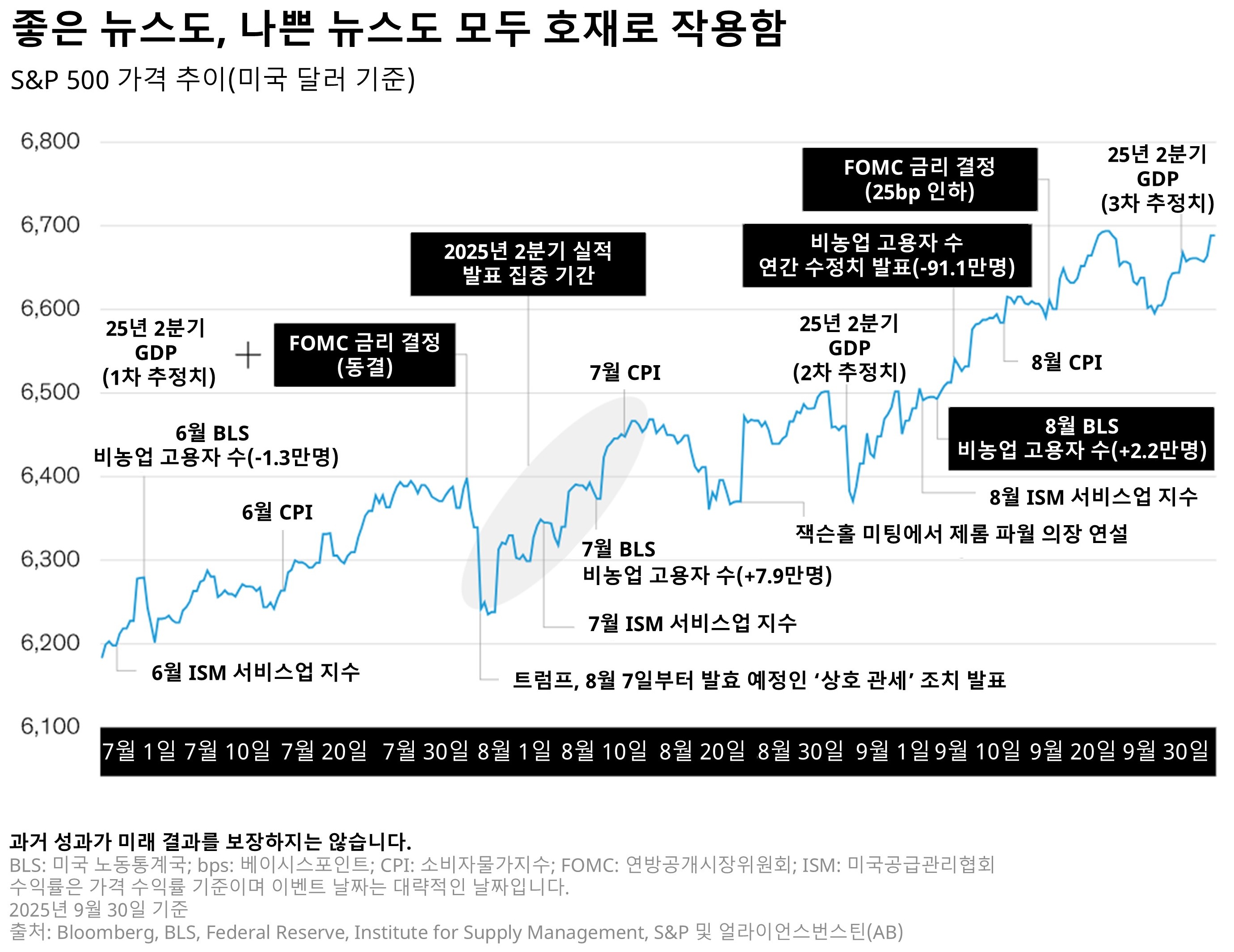 3분기에는 인공지능(AI) 관련 투자 열풍이 시장을 다시 사상 최고치 수준으로 끌어올리며 견조한 수익률을 기록했습니다. 그러나 동시에 경기 둔화 조짐도 나타나기 시작했습니다. 관세 영향으로 인해 무역 민감 업종에서는 가격 상승 압력이 나타났고, 고용시장도 연준이 우려하던 ‘추가적인 냉각(further cooling)’의 기류를 보였습니다. 이로 인해 경제는 불안정한 국면에 접어든 모습이며, 상반된 거시경제 요인들이 맞물리면서 중앙은행의 향후 통화정책 경로를 한층 복잡하게 만들고 있습니다.