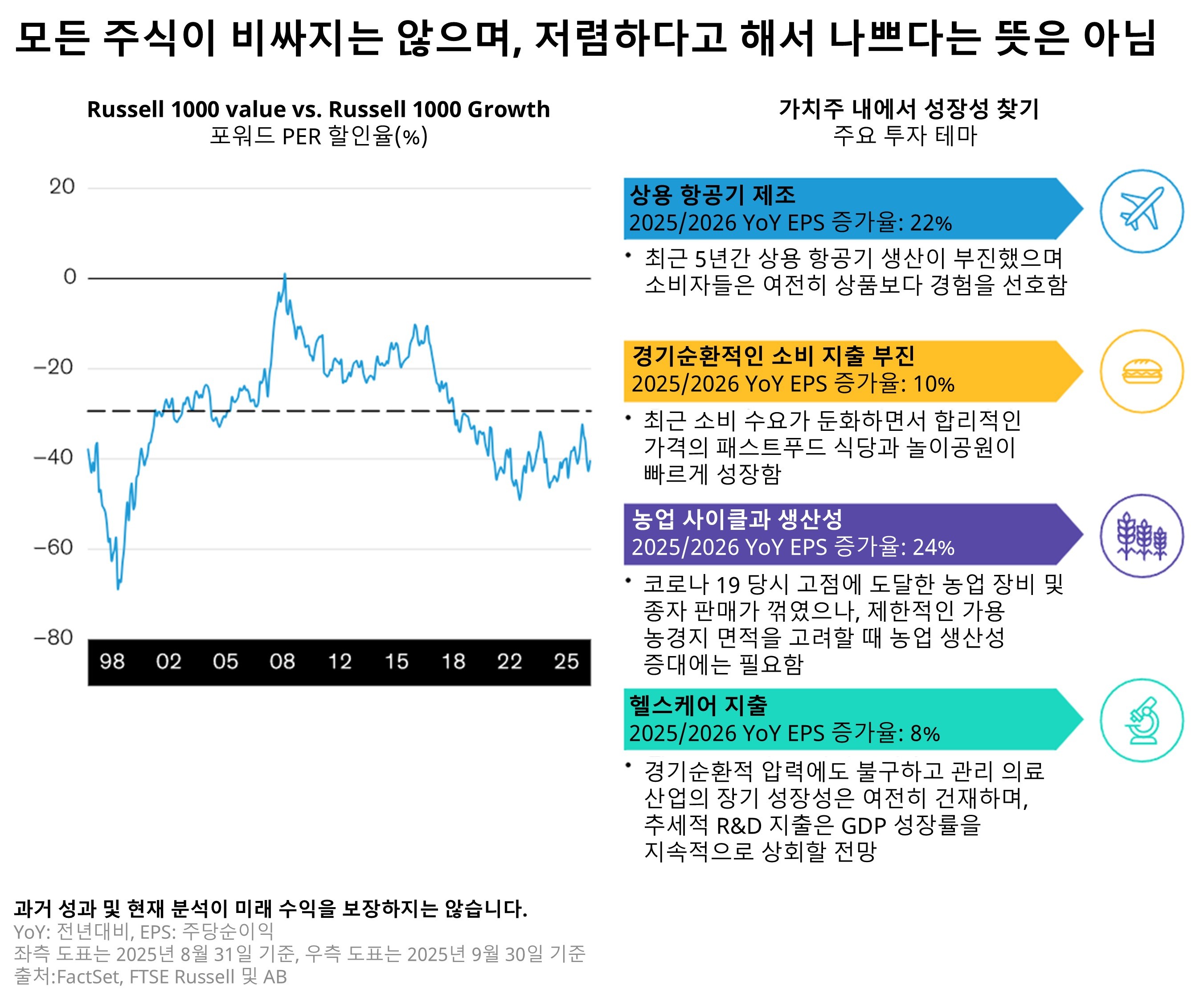 높은 확신을 가질 만한 투자 기회도 여럿 존재하고 있습니다. 빠르게 변화하는 시장 환경과 패시브 지수의 집중도가 높은 상황에서, 대형 우량주 중심의 포트폴리오는 다양한 액티브 전략의 기회를 제공하며 유연한 대응을 가능하게 합니다. 가치주는 여전히 매력적인 밸류에이션에 거래되고 있으며, 많은 가치주들이 향후 경기 회복 국면에서 실적 개선에 따른 상승 여력을 보유하고 있다고 평가합니다(하단 그래프). 또한, 연준의 점진적인 완화 기조와 완만하지만 긍정적인 성장세를 고려할 때, 높은 현금흐름을 창출하는 기업으로의 점진적인 포트폴리오 전환도 유효하다고 판단됩니다.
