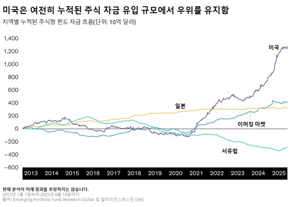 올해 들어 ‘미국의 예외주의는 끝났다’는 견해가 여러 차례 제기되었습니다. 하지만 AB는 이 의견과는 다른 입장입니다. 미국은 자금 유입과 밸류에이션 측면에서 분명히 예외적인 모습을 보여왔습니다. 다만, 이러한 예외성이 사라질 경우, 시장이 크게 하락할 수 있다는 점을 시사하기 때문에 약세장에 투자하는 투자자들에게도 마냥 반가운 조합은 아닙니다.