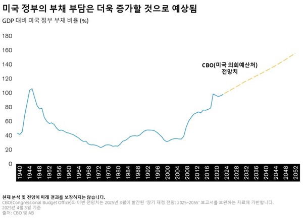 미국 국채 및 달러 전망에 있어서는 미국 예외주의가 약화될 수 있다는 근거가 있다고 생각합니다. 우선, 오랜 기간 우려해왔던 미국의 재정 지속 가능성 문제가 지난 1년 사이 더욱 심각해 졌습니다. 미국 의회예산처(Congressional Budget Office, CBO)는 2050년까지 미국의 국가 부채가 국내총생산(GDP) 대비 150%를 초과할 것으로 전망하고 있습니다. (하단 그래프)