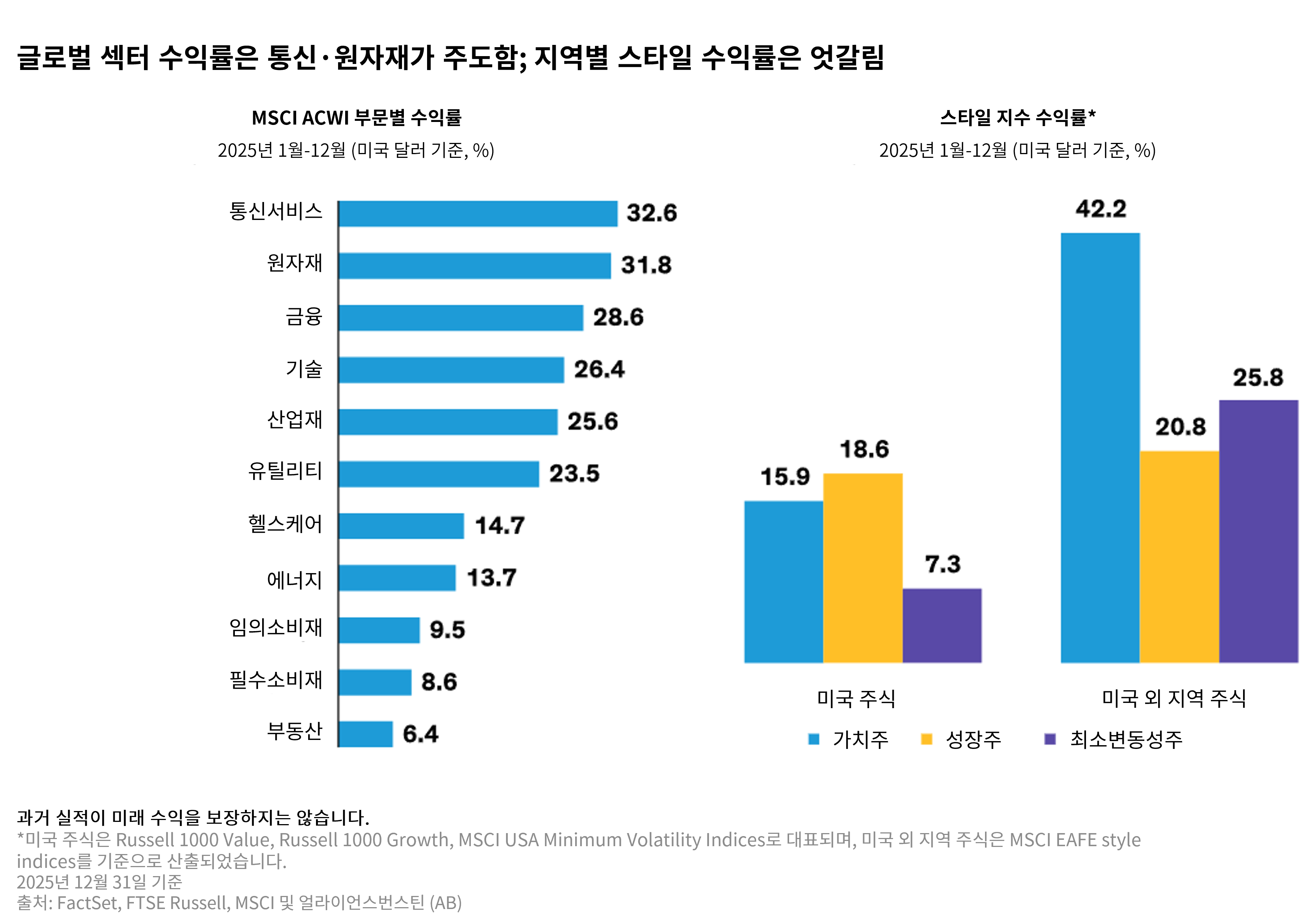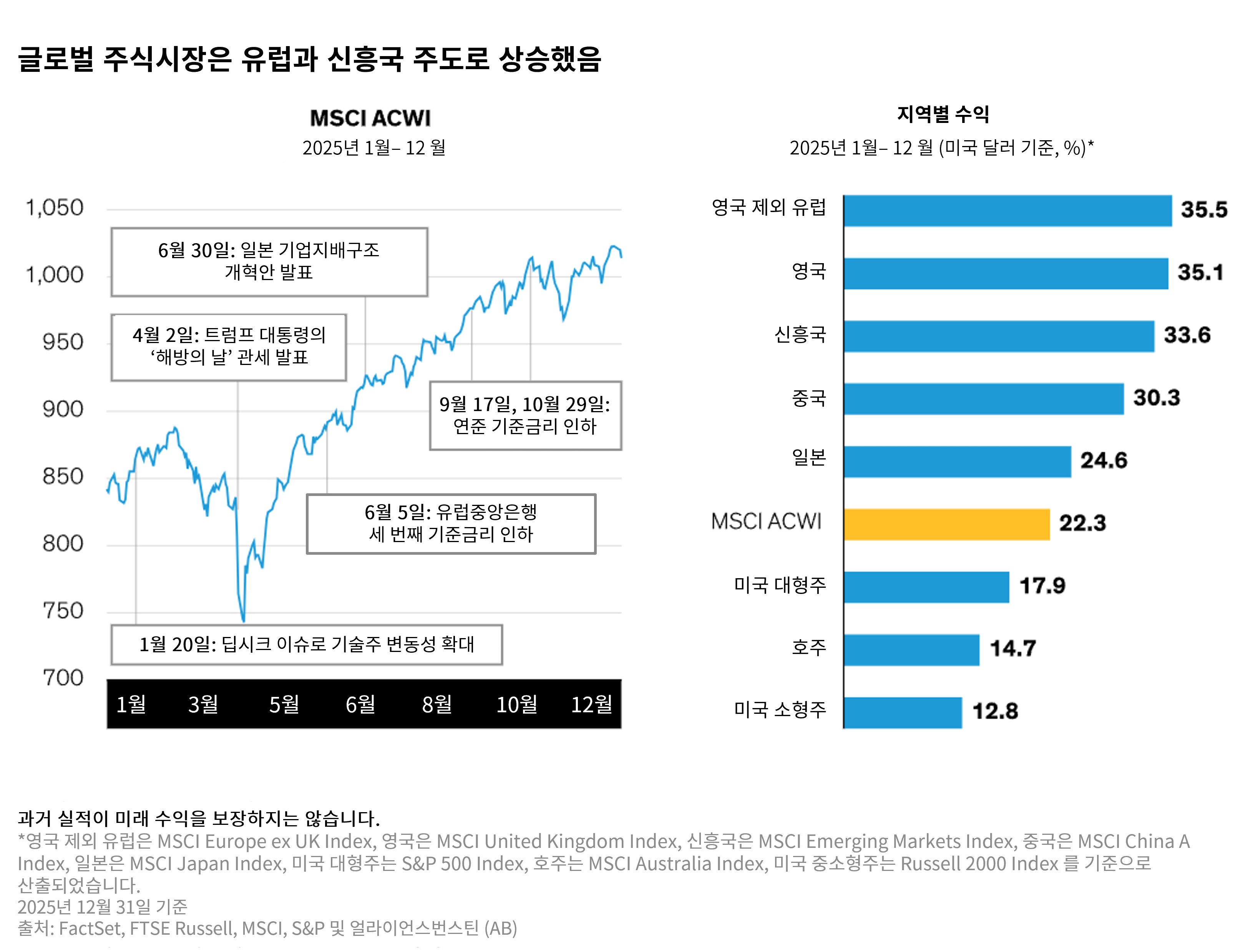 2025년 글로벌 주식시장은 미국의 대형 기술주를 중심으로 견조한 상승세를 기록했습니다. 그러나 인공지능(AI) 관련 투자만이 유일한 수익 원천은 아니었습니다. 지난해 나타난 다양한 수익 요인을 살펴보는 것은 투자자들이 앞으로 전개될 리스크에 대비하는 동시에 더 폭넓은 기회를 모색할 수 있습니다.