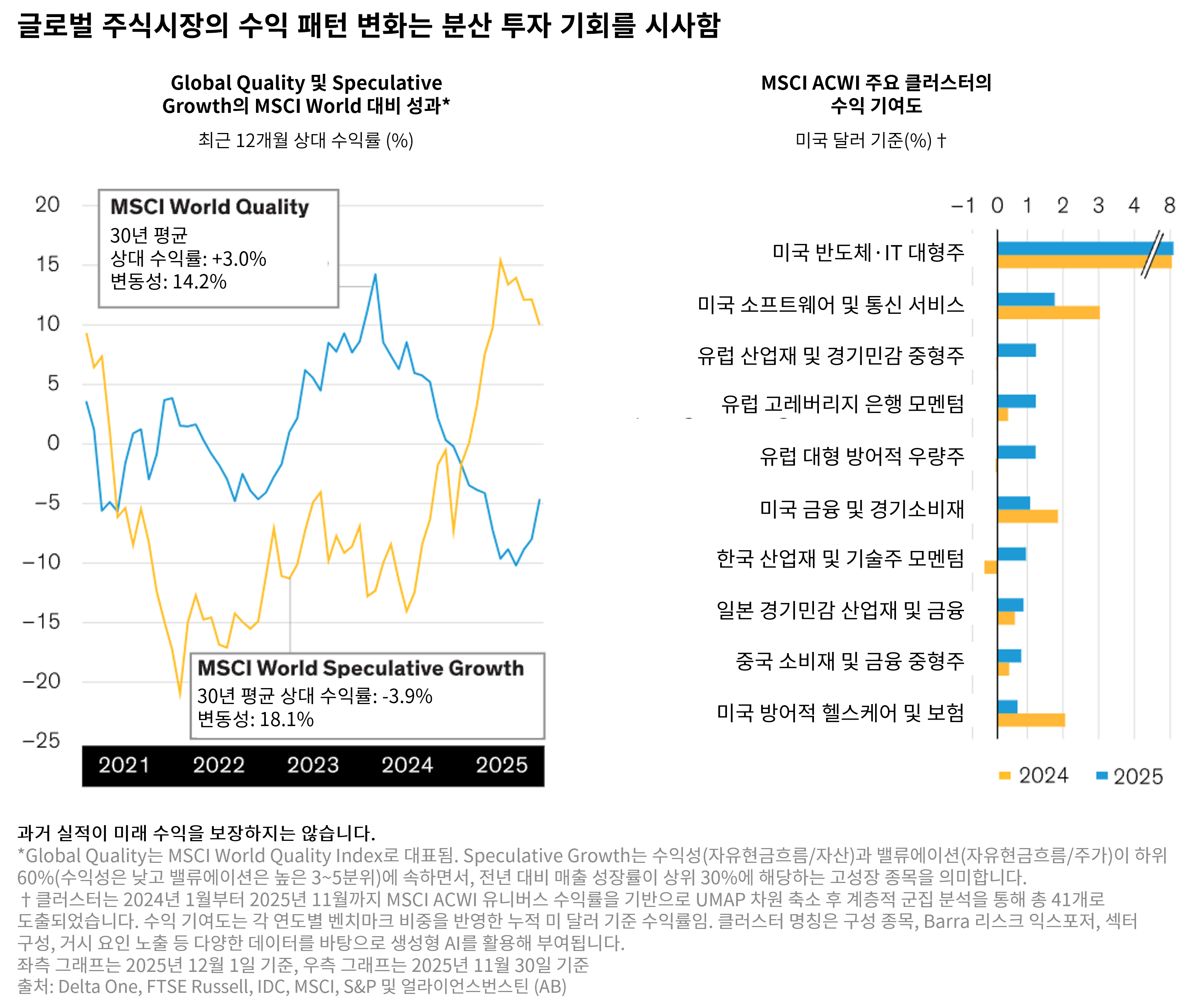 지난 2년간 미국의 AI 하이퍼스케일러 기업들이 성과를 주도해온 가운데, AB의 클러스터 리서치에 따르면 2025년에는 글로벌 투자 테마가 점차 확대되기 시작한 모습이 관찰되었습니다(하단 그래프). 또한 지난해 대부분의 기간 동안 수익 패턴의 변화는 우량주의 약세뿐만 아니라, 미국의 기준금리 인하 기대와 AI 투자 테마로부터 수혜를 받은 투기적 성장주의 랠리에서도 확인됐습니다.