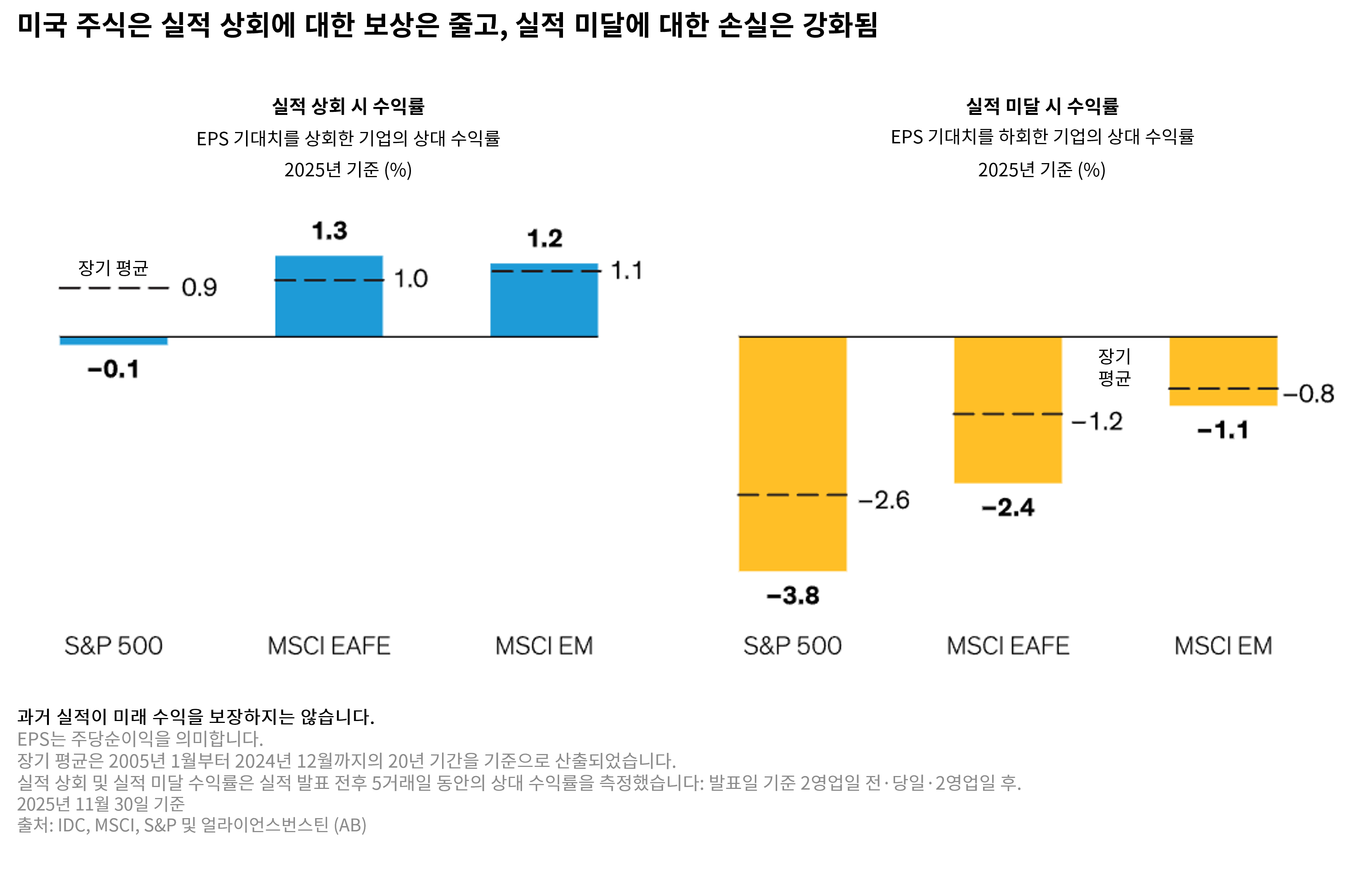 과거에는 미국 기업이 실적 기대치를 상회할 경우 주가가 상승하는 경향이 뚜렷했습니다. 그러나 지난해에는 예상치를 웃도는 실적에도 주가 상승으로 이어지지 않았고, 반대로 기대에 못 미친 경우에는 주가가 더 크게 하락하는 모습을 보였습니다. 반면, 미국 외 지역의 기업들은 실적 전망을 상회할 경우 여전히 긍정적인 주가 반응을 보였습니다(하단 그래프).