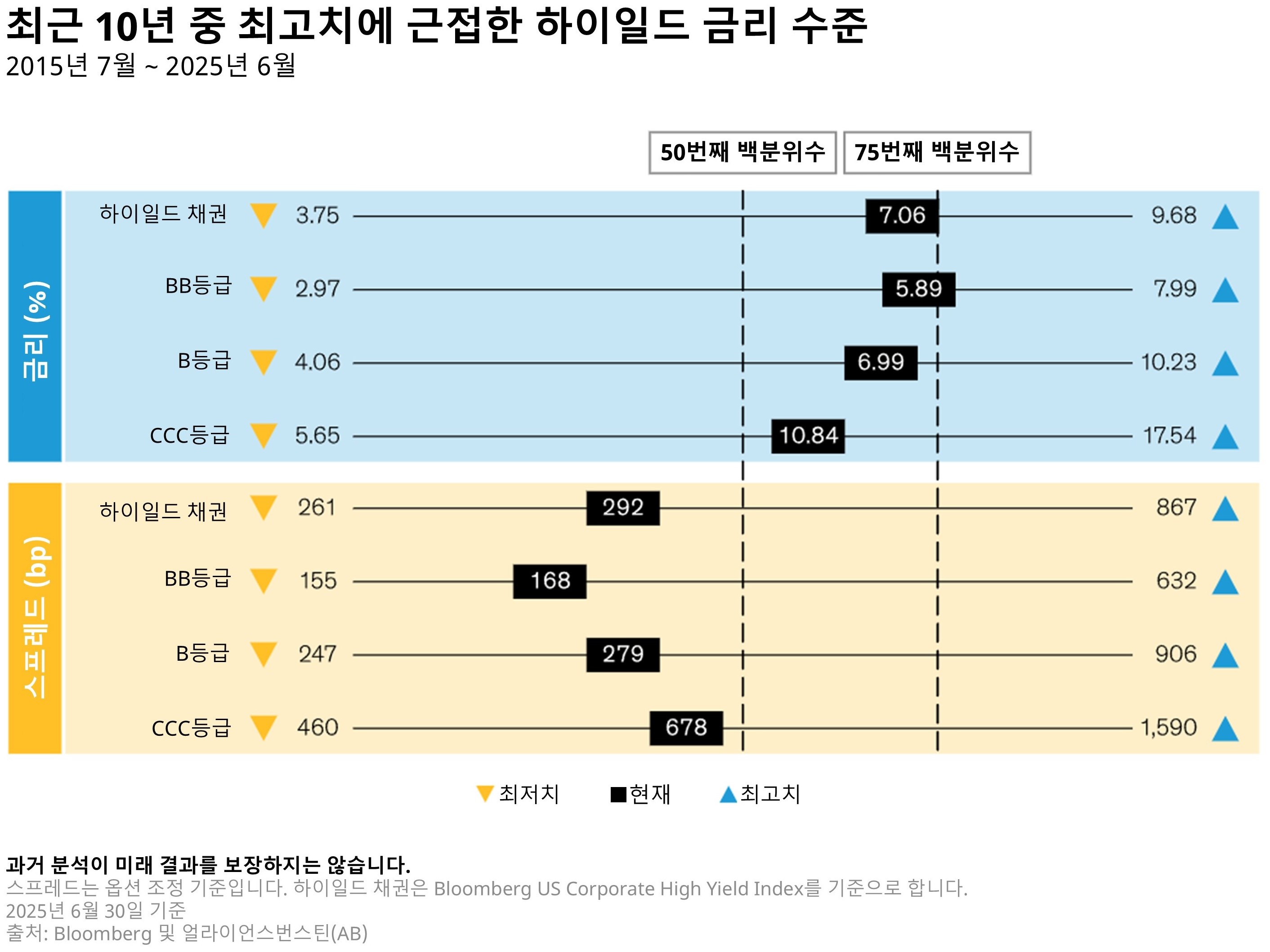 그렇기 때문에 어떤 시장 환경에서도 최저수익률은 향후 5년간의 기대 수익률을 가늠하는 데 있어 신뢰할 만한 지표로 활용됩니다. 현재 하이일드 채권의 최저수익률은 최근 10년 범위 내에서 상위 25% 수준에 근접해 있습니다(하단 그래프). 이처럼 높은 수익률을 감안할 때, 향후 수년간 하이일드 채권은 주식과 견줄 만한 수익을 제공할 수 있을 것으로 전망합니다.