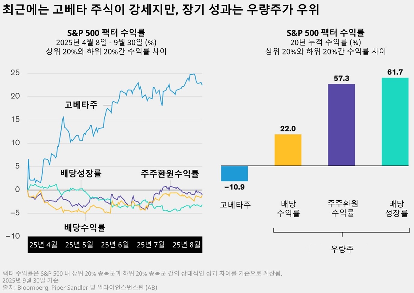 단기적인 상승세는 짜릿할 수 있지만, 과연 지속 가능할까요? 장기 데이터를 살펴보면 이야기는 달라집니다. 지난 20년 동안 우량주는 고베타 주식에 비해 훨씬 더 견조한 흐름을 보여왔습니다. 주주환원율과 배당성장률이 높은 상위 20% 종목군은 하위 20% 종목들 대비 각각 57.3%, 61.7% 높은 수익률을 기록했습니다. 반면, 고베타 주식은 하위 20% 종목들보다 오히려 10.9% 낮은 성과를 나타냈습니다.
