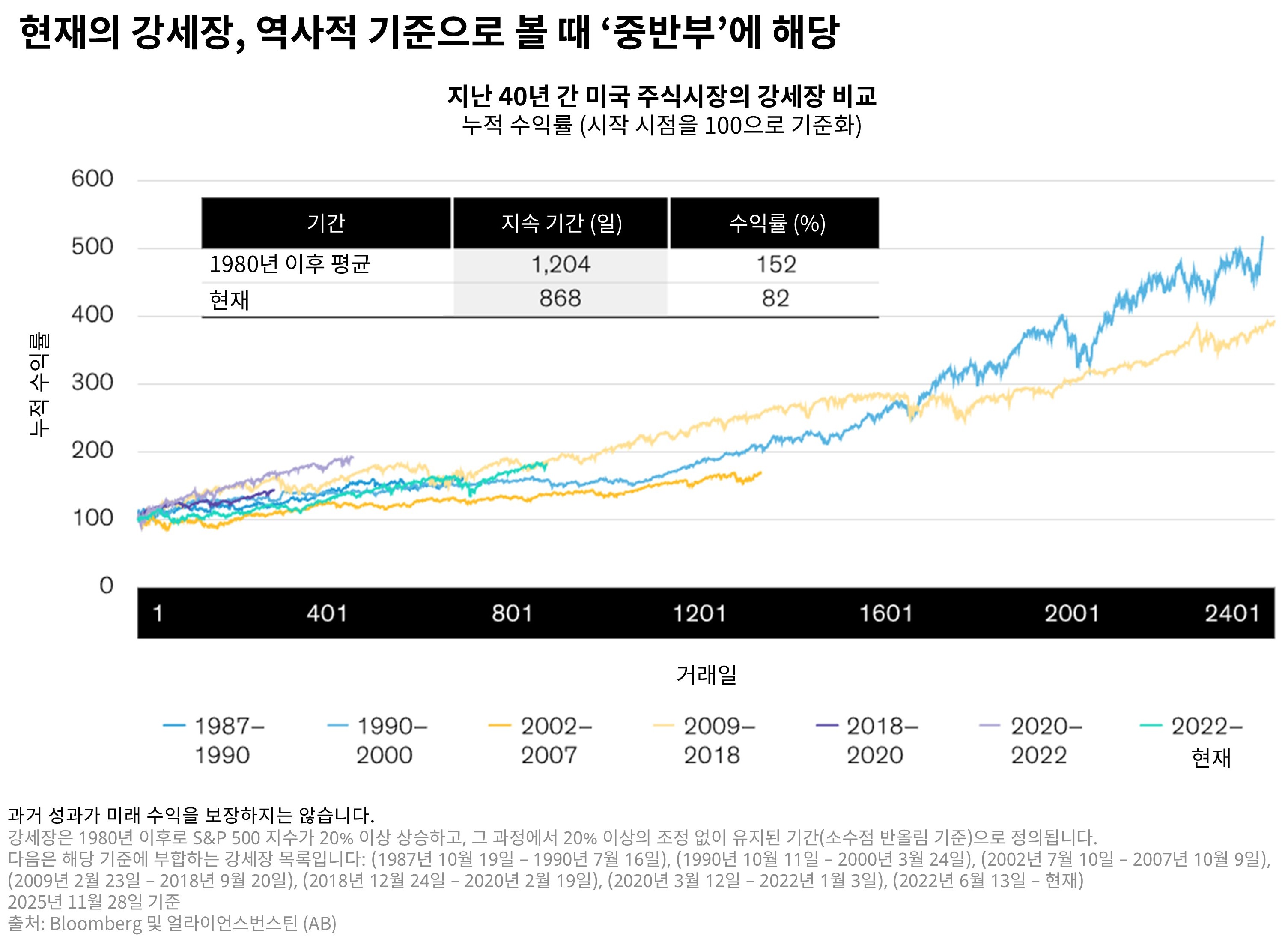 2022년 말 하락장 이후 시작된 글로벌 증시의 상승세는 상당한 수익률을 기록하며 지금까지 이어지고 있습니다. 이로 인해 현재 강세장이 막바지에 이른 것인지에 대한 우려의 목소리도 나오고 있습니다. 하지만 과거 사례를 보면, 강세장은 단순히 오래 지속됐다는 이유로 끝나지는 않습니다. 대부분 외부 충격이나 시장의 과열로 인해 종료되는 경우가 많습니다. 역사적 기준으로 본다면 현재의 상승장은 아직 중반부에 해당하며, 극단적인 상승 구간에 진입했다고 보기는 어렵습니다. (하단 그래프)