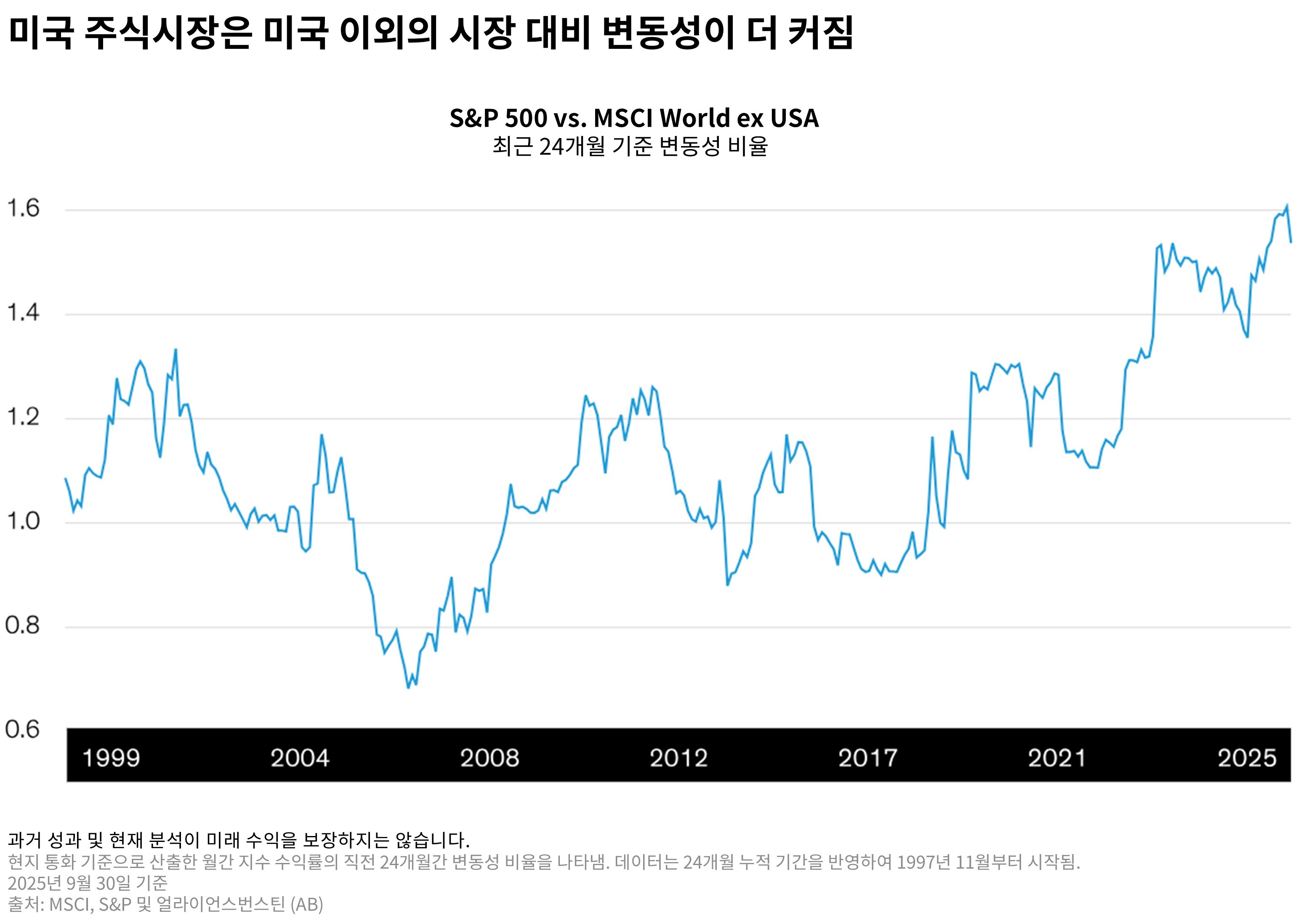 이러한 어려움은 주식 시장 변동성에 그대로 반영되고 있습니다. S&P 500의 변동성은 올해 들어 미국 외 지역 시장 대비 크게 상승했으며, 이는 21세기 들어 이례적인 수준입니다. (하단 그래프)