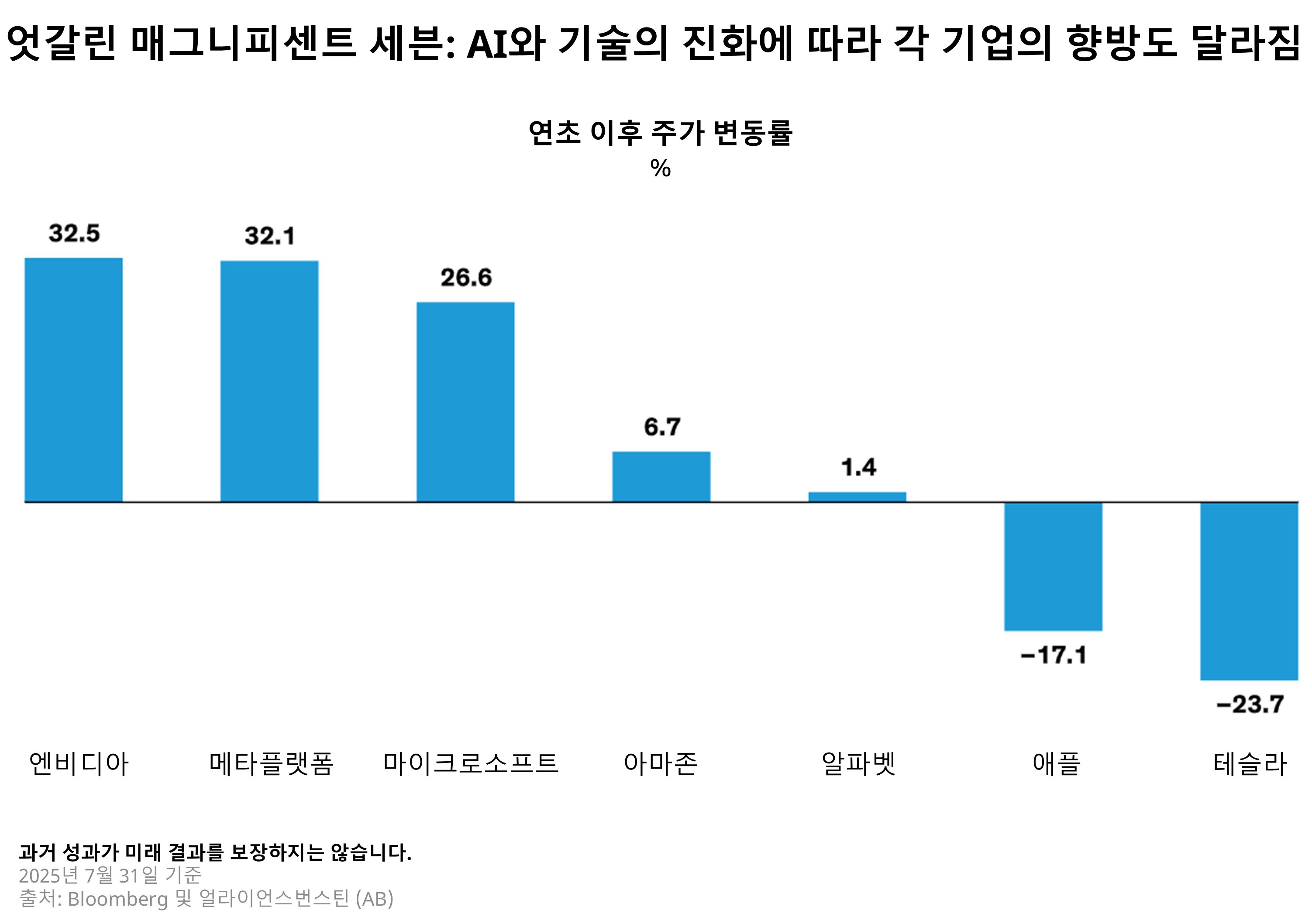 애플(Apple)부터 엔비디아(NVIDIA)에 이르기까지, 매그니피센트 7은 2023년과 2024년에 걸쳐 거의 동조화된 흐름을 보이며 S&P500 성과를 큰 폭으로 상회했습니다. 이는 인공지능(AI) 혁신을 주도하는 이들 기업의 기술력과 성장성이 주요한 동력으로 작용했기 때문입니다. 그러나 2025년 들어서는 연초 이후 주가 성과가 크게 엇갈리는 모습이 나타나고 있습니다. (하단 그래프)
