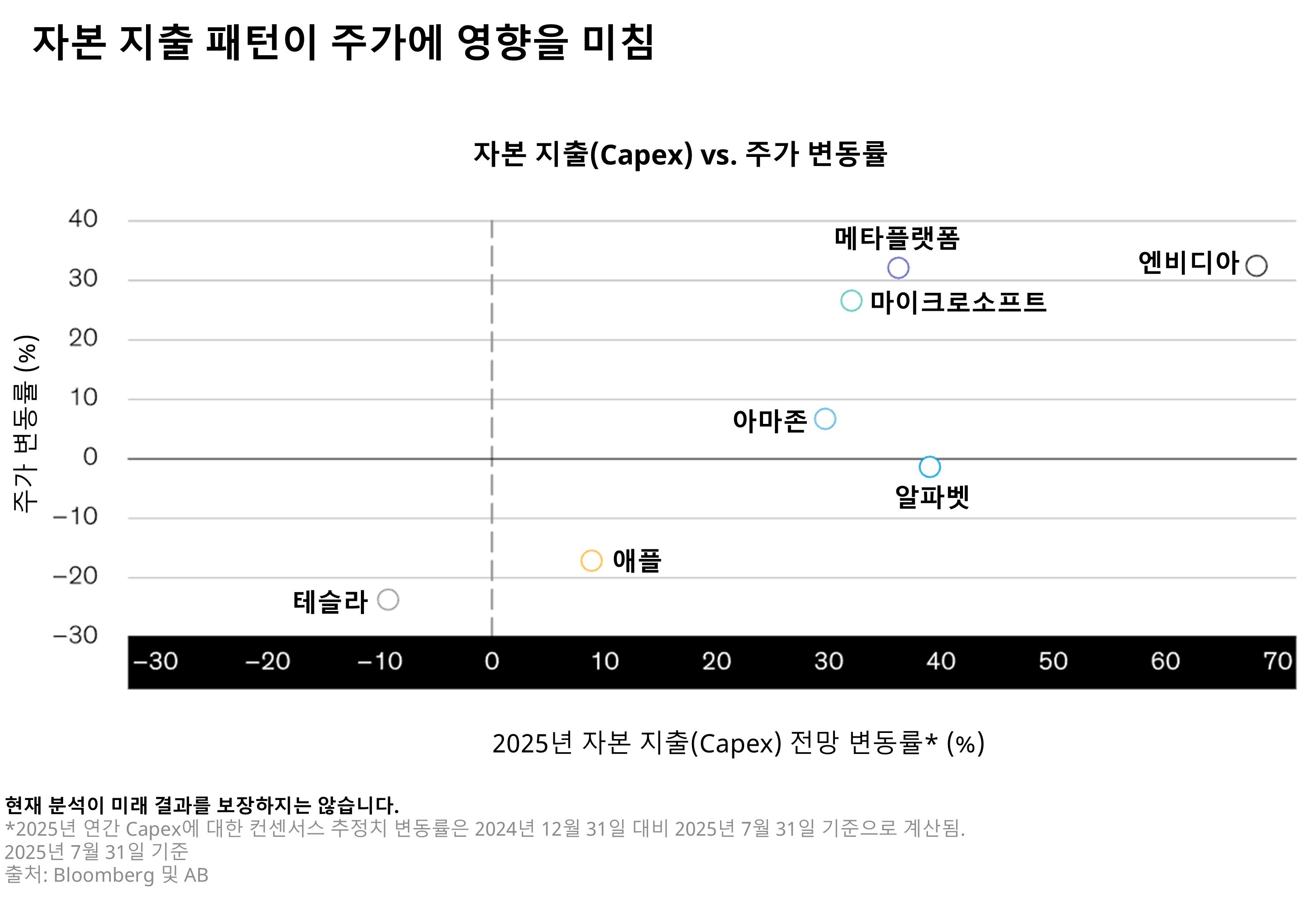 자본지출 규모와 주가 성과를 비교해 보면 이러한 경향은 더욱 뚜렷하게 나타납니다 (하단 그래프). 애플과 테슬라(Tesla)는 상대적으로 자본지출이 적은 기업으로 올해 부진한 성과를 보인 반면, 추가적인 자본지출 확대가 예상되는 엔비디아와 메타플랫폼(Meta Platforms)은 주가가 큰 폭으로 상승했습니다.