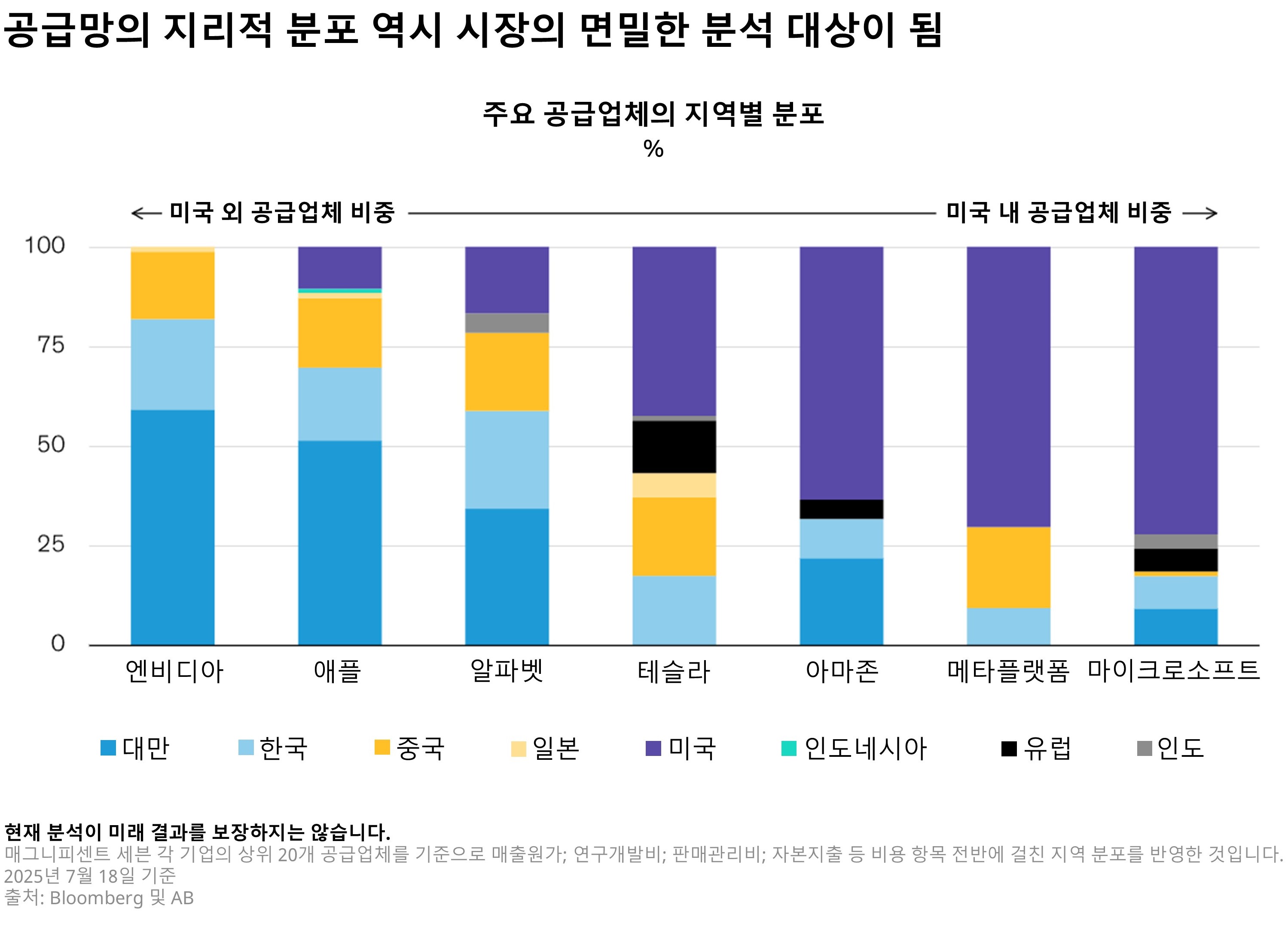 트럼프 대통령의 관세 정책은 다양한 산업의 기업들에 부담을 주고 있습니다. 매그니피센트 7 기업들 역시 공급망 구조에 따라 무역 장벽에 대한 민감도가 서로 다르게 나타나고 있습니다. 미국 내 공급업체 비중이 높고, 해외 의존도가 낮은 기업일수록 관세 리스크 확대 국면에서도 더 나은 성과를 보이고 있습니다.